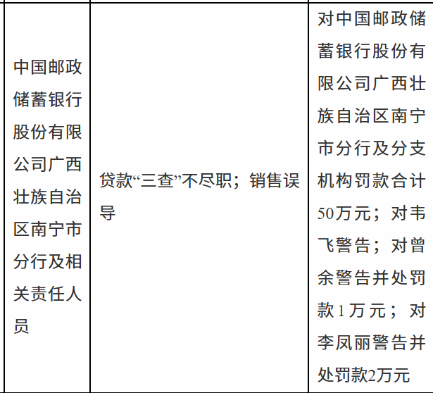 1月30日,广西监管局行政处罚信息公开表显示,中国邮政储蓄银行股份有限公司广西壮族自治区南宁市分行因贷款“三查”不尽职;销售误导被罚款合计50万元。责任人韦某被警告;曾某被警告并处罚款1万元;李某丽被警告并处罚款2万元。