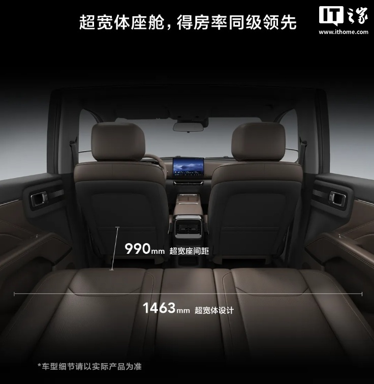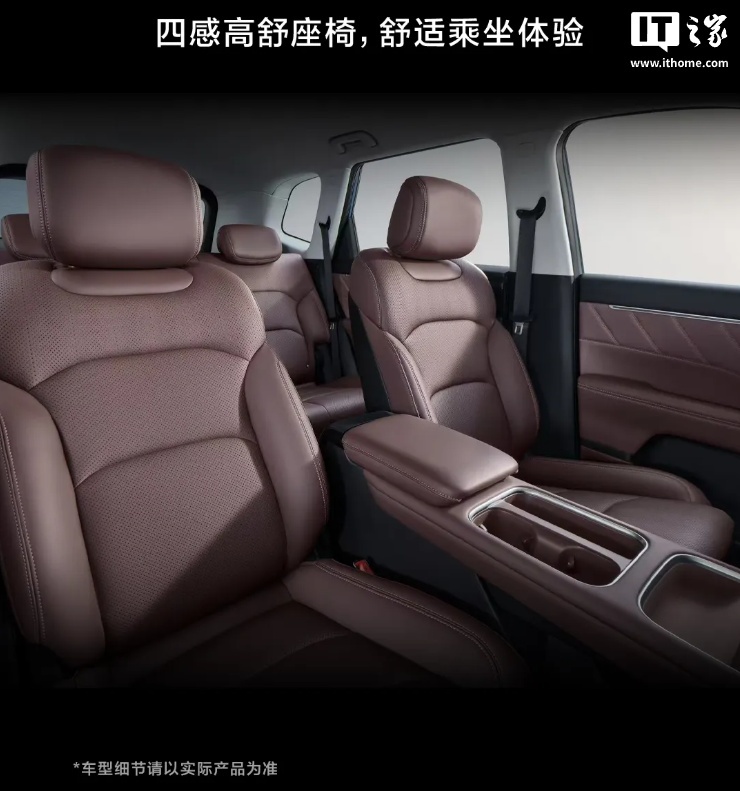 系列车型提供胡桃棕和暖沙棕两款内饰,内置四感高舒座椅,采用 990mm 座间距 + 1463mm 宽体设计,拥有超宽体座舱。