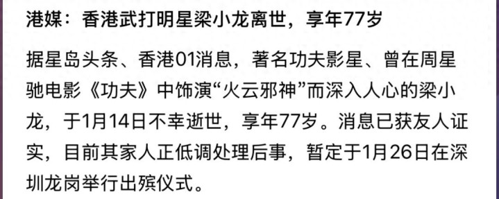 2026 年 1 月 14 日,港媒传来悲痛消息:著名功夫影星梁小龙不幸逝世富鑫中证,享年 77 岁,友人已证实该消息,家人正低调处理后事,出殡仪式定于 1 月 26 日在深圳龙岗举行。